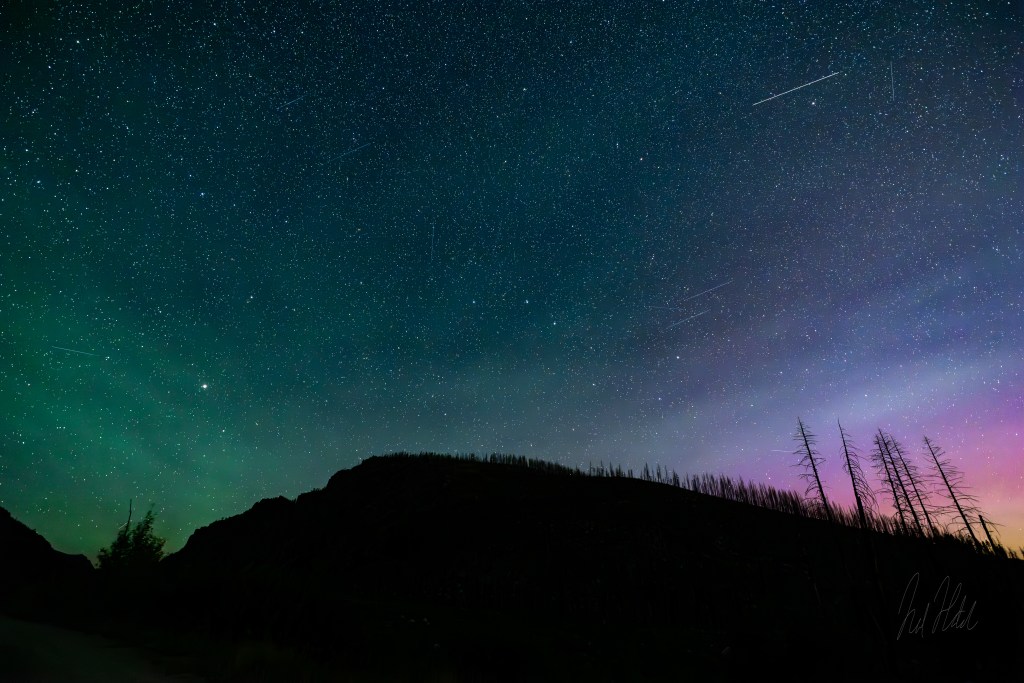On the same magical night I captured the Milky Way stretching overhead, I turned my camera toward the northern sky, hoping to catch more of the auroral activity forecasted during the recent solar storm. What unfolded was a surreal mix of atmospheric colors and meteor streaks that made this image feel like a cosmic painting.